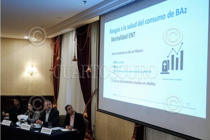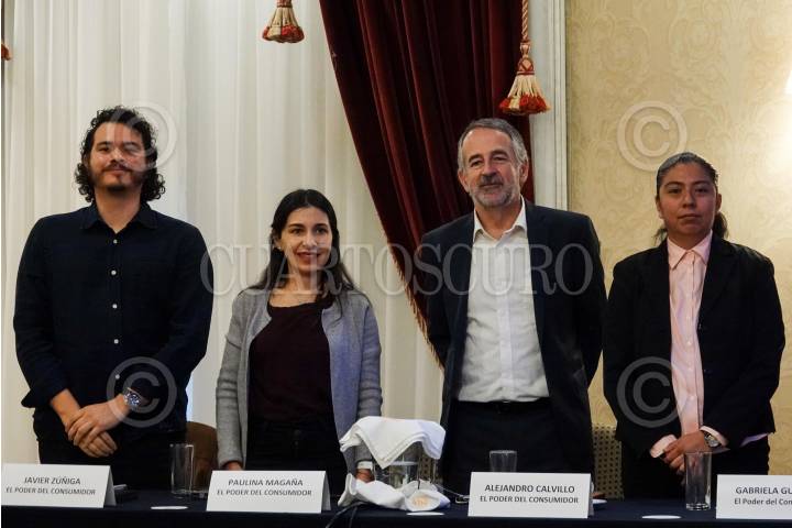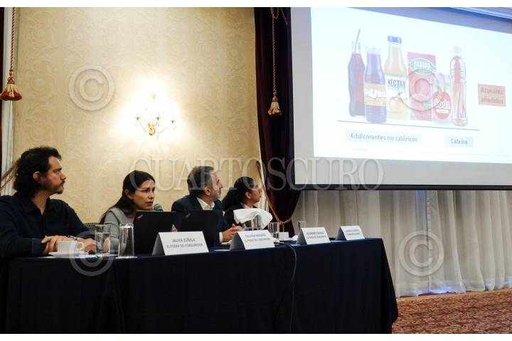 CIUDAD DE MÉXICO, 02JULIO2024.- Las y los integrantes de la Asociación Civil “El Poder del Consumidos”: Javier Zúñiga, coordinador jurídico; Paulina Magaña, coordinadora de Salud Alimentaria; Alejandro Calvillo, director, y Gabriela Guzmán, abogada de la AC, ofrecieron conferencia de prensa para dar a conocer el recurso presentado ante Cofepris para que se declare a las bebidas azucaradas, endulzantes y con cafeína como riesgos a la salud. FOTO: GALO CAÑAS/CUARTOSCURO.COM