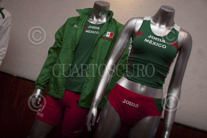 MÉXICO, D.F., 25FEBRERO2013.-La Federación Mexicana de Asociaciones de Atletismo (FMAA) presentó esta mañana los uniformes que portarán sus deportistas en las competencias internacionales, a partir de este año y hasta 2016 gracias a un contrato en especie por 12 millones de pesos con la marca Joma. A partir de ahora, los 350 representantes de atletismo que esperan enviar a diversas justas internacionales en 2013 recibirán un kit de 18 prendas, desde maletas de viaje hasta chamarras, para su participación en competencias. Todos los deportistas que representen a México están obligados a usar estas prendas en el Mundial de Moscú, del próximo verano. El evento estuvo encabezado por Antonio Lozano, presidente de la FMAA y le acompañó Carlos Padilla Becerra, presidente del Comité Olímpico Mexicano. FOTO: JUAN PABLO ZAMORA / CUARTOSCURO.COM