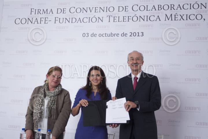 MÉXICO, D.F., 03OCTUBRE2013.- Giovanna Bruni, presidenta de la Fundación Telefónica; Alma Carolina Viggiano Austria, Directora General del Consejo Nacional de Fomento Educativo (CONAFE); y Francisco Gil Díaz, director general de Telefónica, firmaron un convenio de colaboración. FOTO: IVÁN STEPHENS /CUARTOSCURO.COM