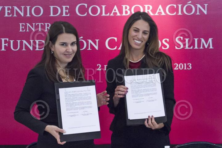 MÉXICO, D.F., 02DICIEMBRE2013.- Alma Carolina Viggiano, directora general del Conafe, y Johanna Monique Slim de Elías, presidenta de Fundación Carlos Slim, firmaron un convenio de colaboración entre ambas instituciones. FOTO: ISAAC ESQUIVEL / CUARTOSCURO.COM