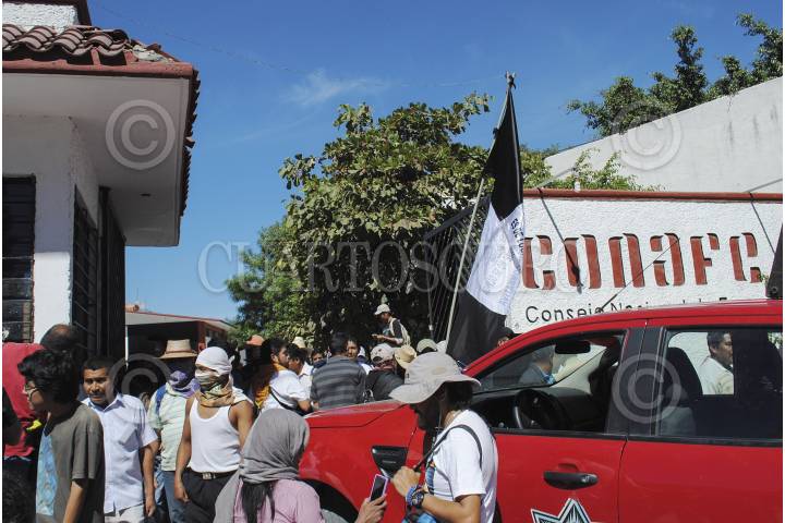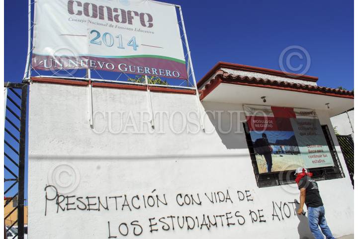 CHILPANCINGO, GUERERRO, 09DICIEMBRE2014.- Profesores que integran la Coordinadora Estatal de Trabajadores de la Educación en Guerrero (CETEG), profesores de la Coordinadora Nacional de Trabajadores de la Educación (CNTE) e integrantes del Frente Popular Francisco Villa; clausuraron las instalaciones de CONAFE, para exigir la presentación con vida de los 42 estudiantes desaparecidos y para pedir al gobierno que inviertan más en educación. FOTO: JOSÈ I. HERÀNDEZ /CUARTOSCURO.COM