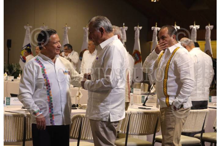 Julio Menchaca Salazar, Adán Augusto López, y Cuauhtémoc Blanco, durante los trabajos de la VI Reunión Extraordinaria de la Conferencia Nacional de Gobernadores.
