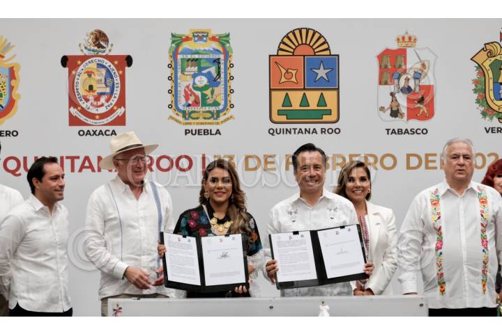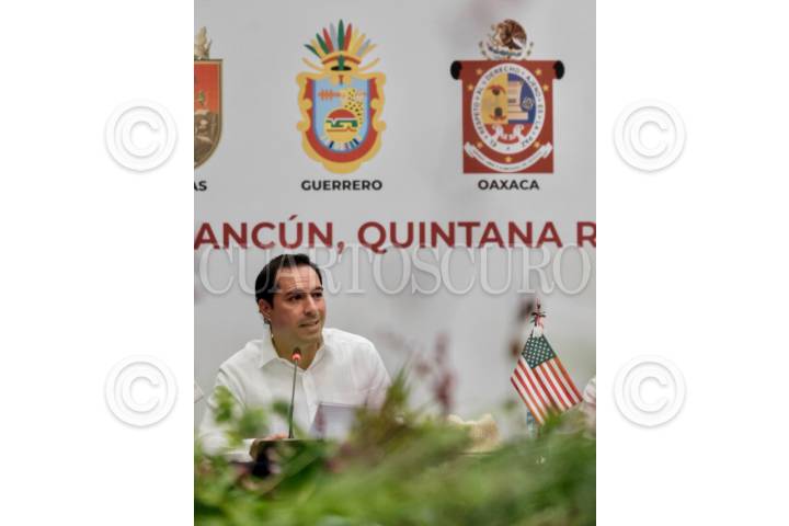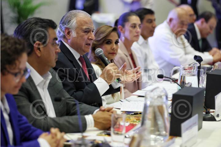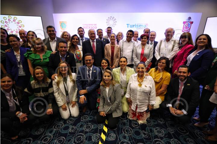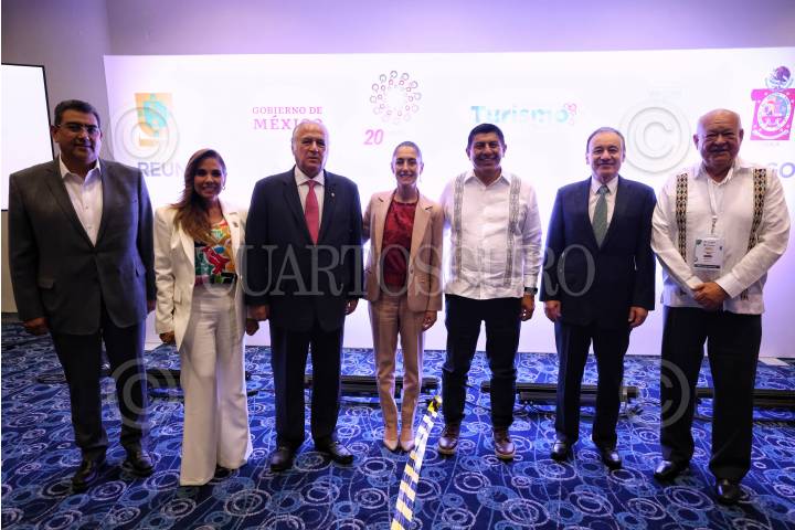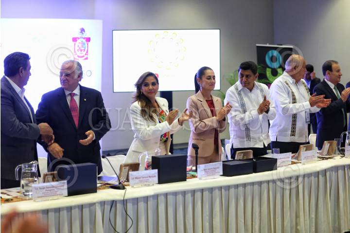 Mara Lezama, Miguel Torruco, Claudia Sheinbaum, Salomón Jara, Alfonso Durazo, y Víctor Manuel Castro Cosío, durante la reunión de la Conago, previó a la inauguración del Tianguis Turístico 2023.