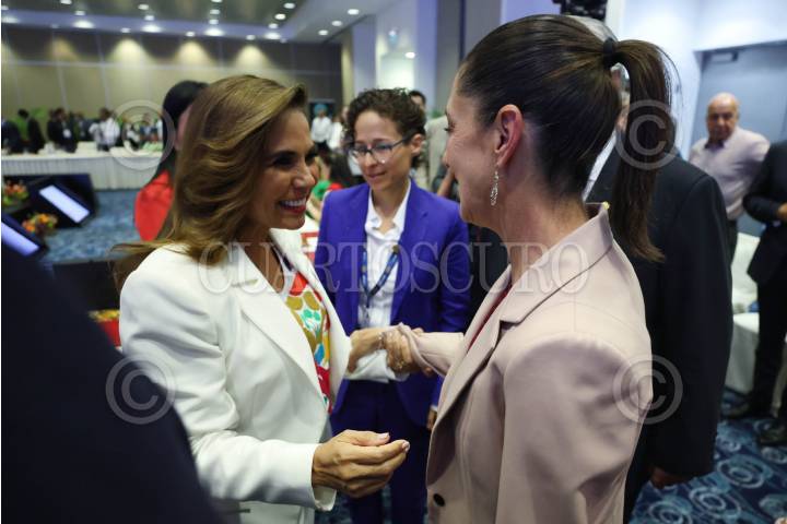 Mara Lezama, y Claudia Sheinbaum, durante la reunión de la Conago, previo a la inauguración del Tianguis Turístico 2023, en el Citibanamex.