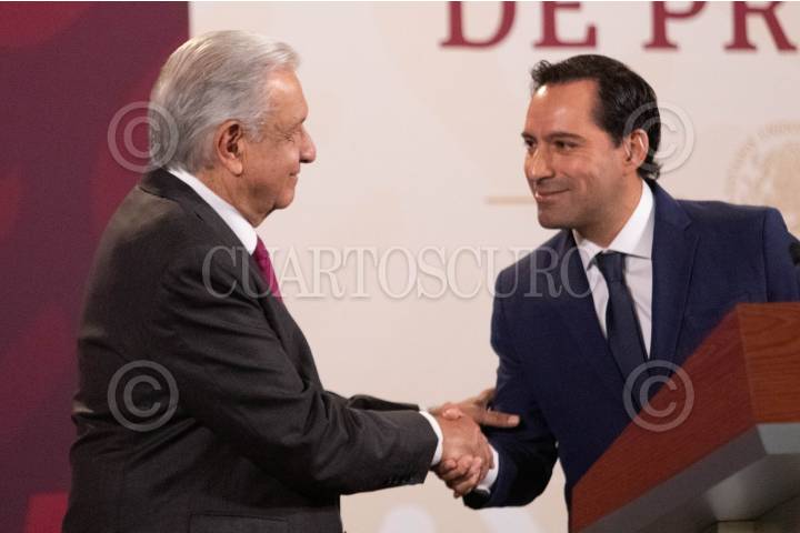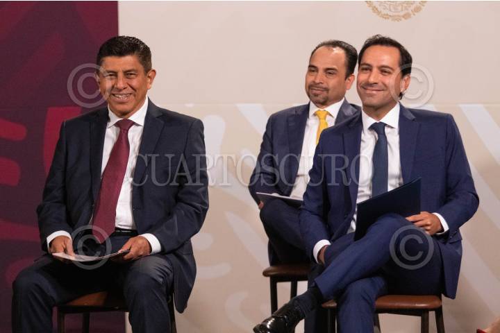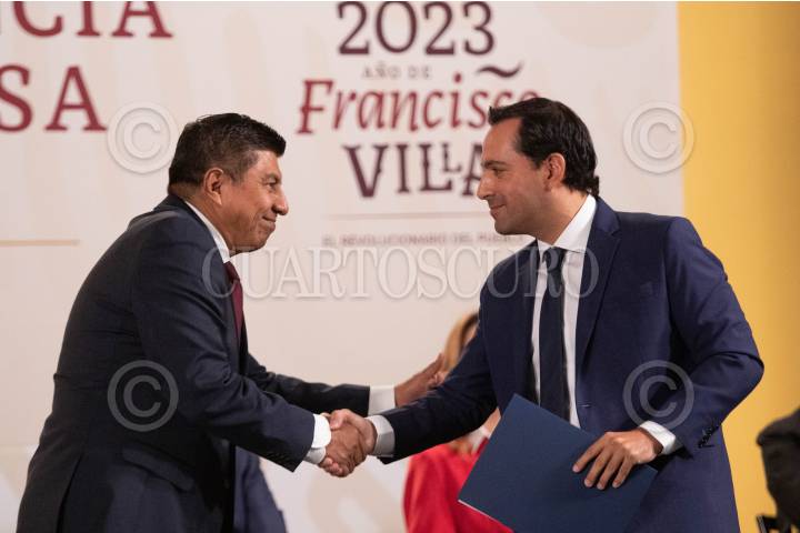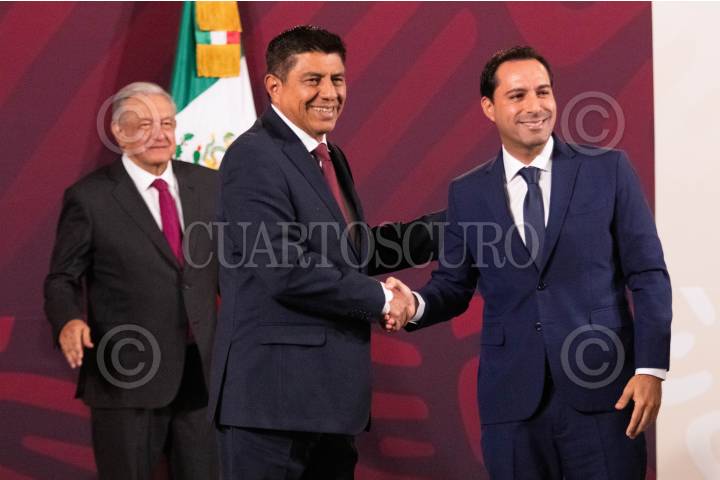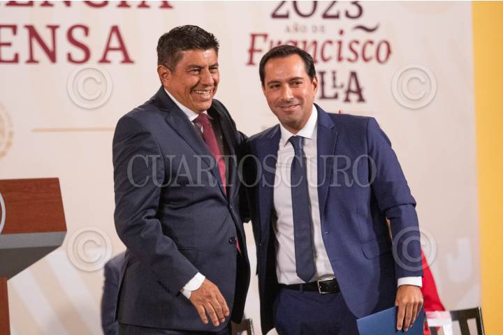 CIUDAD DE MÉXICO, 09OCTUBRE2023.- Salomón Jara, gobernador de Oaxaca, le entregará la presidencia de la Cobaho a Mauricio Vila Dosal, gobernador de Yucatán, durante la mañanera, en Palacio Nacional. FOTO: MOISÉS PABLO/CUARTOSCURO.COM