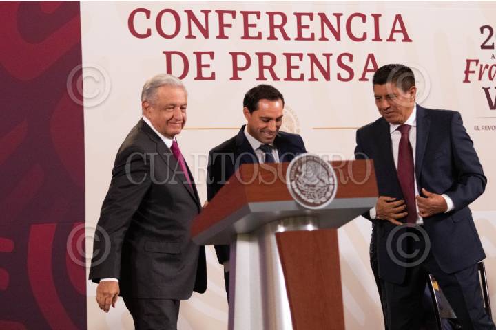CIUDAD DE MÉXICO, 09OCTUBRE2023.- Andrés Manuel López Obrador, Presidente de México, atestiguó el cambio de presidencia de la Conago. Salomón Jara, gobernador de Oaxaca, entregó el liderazgo a Mauricio Vila, gobernador de Yucatán, durante la mañanera. FOTO: MOISÉS PABLO/CUARTOSCURO.COM