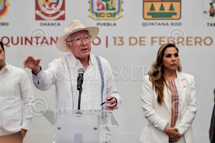 CANCÚN, QUINTANA ROO, 13FEBRERO2024.- La coordinadora de la Comisión Sur- Sureste de la Conferencia Nacional de Gobernadores (CONAGO), Mara Lezama Espinosa, acompañada del Embajador de Estados Unidos en México, Ken Salazar, inauguró en Cancún el octavo encuentro con la embajada de Estados Unidos de América. Asimismo, participaron el presidente de la CONAGO y gobernador de Yucatán, Mauricio Vila Dosal, así como Miguel Torruco, secretario de Turismo asistió en representación del Presidente de México Andrés Manuel López Obrador. FOTO: ELIZABETH RUIZ/CUARTOSCURO.COM
