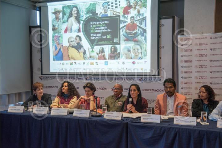 Patricia Uribe Zúñiga, de INMUJERES; Susana Harp, senadora de la República; Fabiola Fernández Guerra de COPERA; Pedro S. Peñalosa, de México Negro; Mónica Maccise, titular de CONAPRED; Hugo Arellanes, de Huella Negra y Rosa María Castro Salinas de AMCO, durante la presentación de la campaña “AfroCenso MX”.