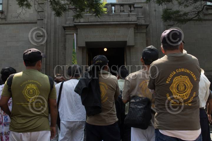 CIUDAD DE MÉXICO, 20MAYO2019.- Integrantes y representantes de la Coordinadora Regional de Autoridades Comunitarias-Policía Comunitaria (CRAC-PC) de Guerrero protestaron afuera de la Suprema Corte de Justicia de la Nación (SCJN) a la cual acudieron para presentar una acción de inconstitucionalidad a la ley 14 del Congreso local en donde se desaparece la figura de Policía Comunitaria o Policía Rural, ellos señalan que esta reforma transgrede sus derechos de autodeterminación como pueblos indígenas, dicha ley fue impulsada por el actual gobernador Héctor Astudillo. Los acompañaron en el mitin alcaldes de diferentes municipios y la diputada federal Araceli Ocampo Manzanares para esperar una respuesta de las autoridades de la SCJN. FOTO: GRACIELA LÓPEZ /CUARTOSCURO.COM