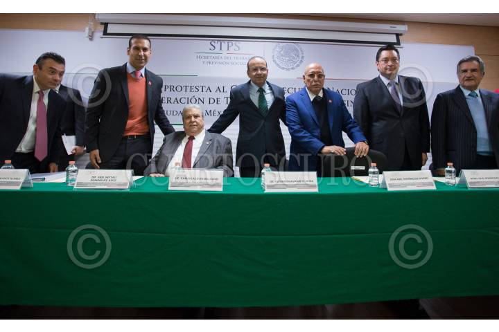 CIUDAD DE MÉXICO, 19DICIEMBRE2017.- Abel Neftalí Domínguez Azuz, nuevo secretario general de la Confederación de Trabajadores y Campesinos, Carlos Aceves del Olmo, secretario general de la Confederación de Trabajadores de México, Alfonso Navarrete Prida, secretario del Trabajo y Previción Social (STPS), Abel Dimínguez Rivero, presidente vitalicio de la CTC y Raúl Domínguez Rx, secretario general saliente de de la CTC , durante la toma de protesta al Comité Ejecutivo Nacional de la Confederación de Trabajadores y Campesinos. FOTO: ADOLFO VLADIMIR /CUARTOSCURO.COM