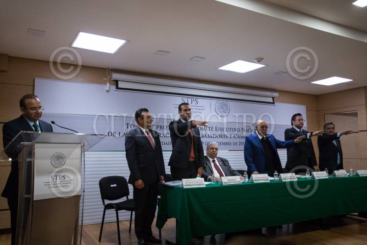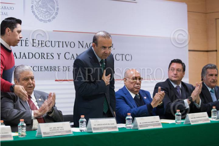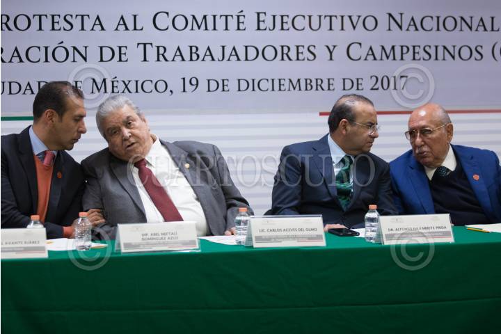 CIUDAD DE MÉXICO, 19DICIEMBRE2017.- Carlos Aceves del Olmo, secretario general de la Confederación de Trabajadores de México, Alfonso Navarrete Prida, secretario del Trabajo y Previción Social (STPS), Abel Dimínguez Rivero, presidente vitalicio de la CTC y Raúl Domínguez Rx, secretario general saliente de de la CTC , durante la toma de protesta al Comité Ejecutivo Nacional de la Confederación de Trabajadores y Campesinos. FOTO: ADOLFO VLADIMIR /CUARTOSCURO.COM