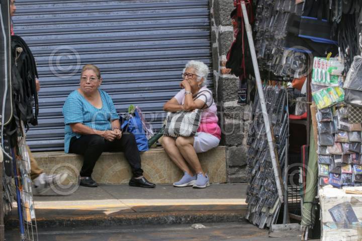 CUERNAVACA, MORELOS, 21MAYO2025.- Vida cotidiana en las calles de Cuernavaca, dos mujeres de la tercera edad descansan en la entrada de un negocio formal rodeadas de puestos de comercio informal, imagen tomada la tarde de ayer en el circuito del mercado Adolfo López Mateos. FOTO: MARGARITO PÉREZ RETANA/ CUARTOSCURO.COM