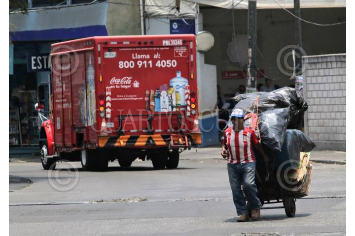 CUERNAVACA, MORELOS, 21MAYO2025.- Imagen cotidiana en la ciudad de Cuernavaca, un adulto lleva su diablito cargado de cartón, pet y otros materiales reciclables para su venta, a lado pasa un camión repartidor de refresco. Imagen tomada la tarde de ayer en el circuito del mercado Adolfo López Mateos. FOTO: MARGARITO PÉREZ RETANA/CUARTOSCURO.COM