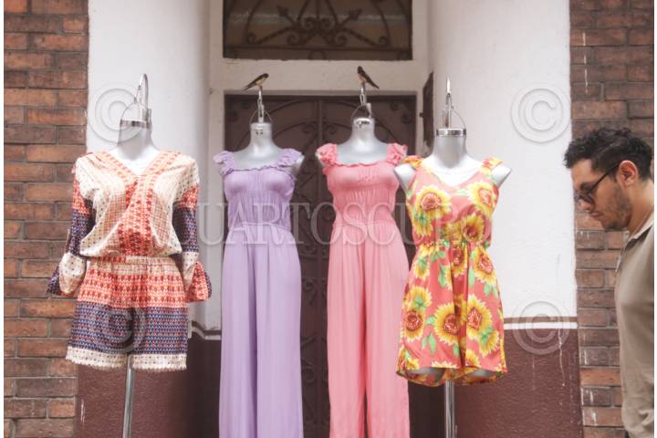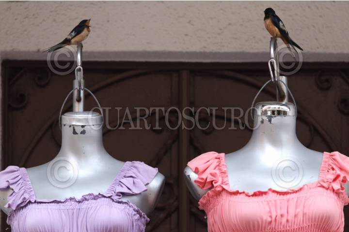 CUERNAVACA, MORELOS, 26MAYO2025.- Vida cotidiana en la calle Arteaga en el centro de la ciudad, dos golondrinas comunes se posan sobre dos maniquíes vestidos con ropa de mujer que se venden en la vía publica. FOTO: MARGARITO PÉREZ RETANA/CUARTOSCURO.COM