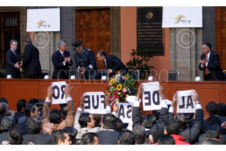 MEXICO, D.F. 21MARZO2005.- La pancarta en pro del jefe de Gobierno capitalino, Andrés Manuel López Obrador, fue mostrada varias veces durante la ceremonia del CXCIX aniversario del natalicio del Benemèrito de las Amèricas, Benito Juàrez, encabezada por el secretario de Gobernación, Santiago Creel. FOTO: Sandra Perdomo/CUARTOSCURO.COM