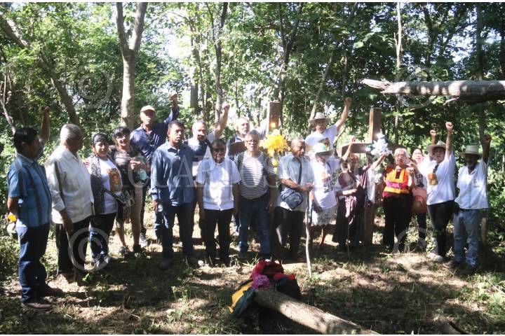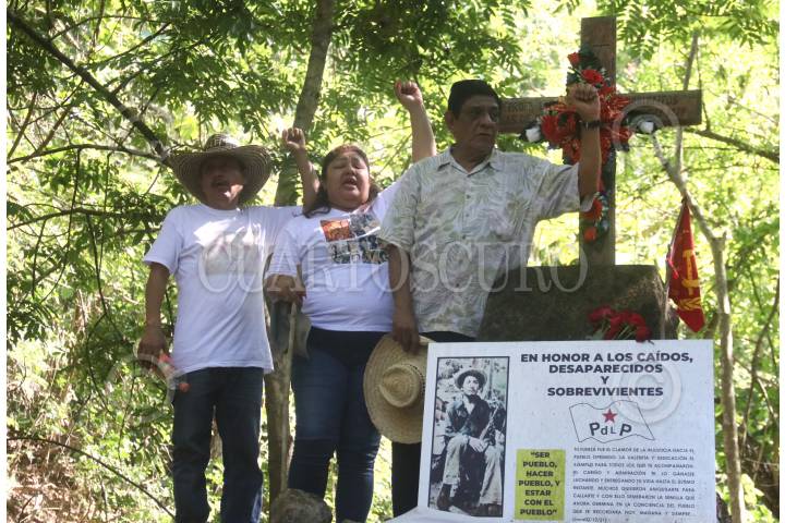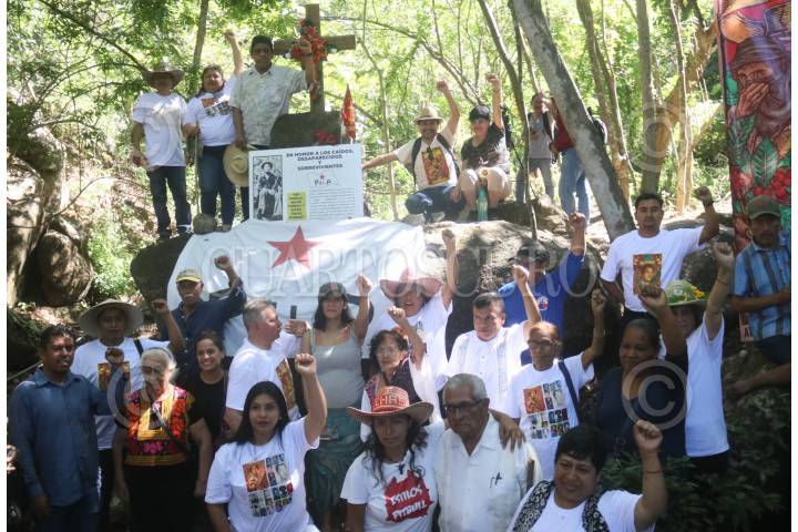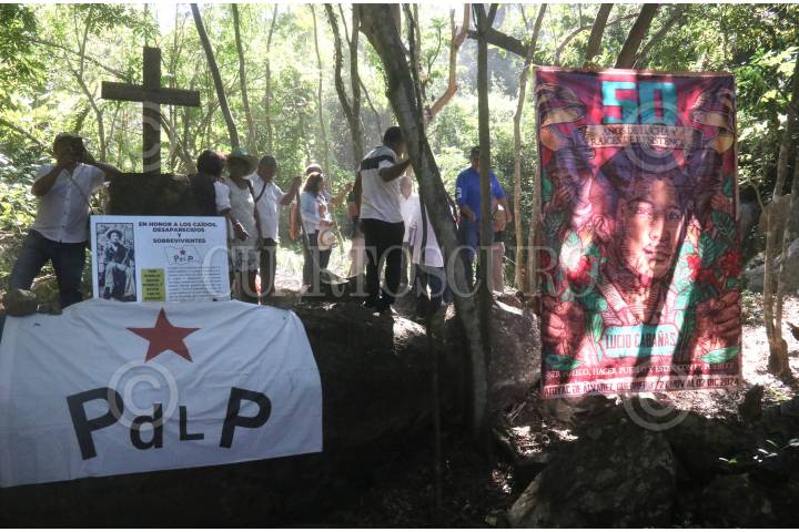 TECPAN DE GALEANA, GUERRERO, 01DICIEMBRE2024.- Familiares, compañeros de lucha y decenas de simpatizantes de Lucio Cabañas Barrientos, maestro, guerrillero, y líder de la Brigada Campesina de Ajusticiamiento del Partido de los Pobres, acudieron al sitio donde murió en combate el 2 de diciembre de 1974. Realizaron un acto de memoria en la cañada del Otatal, dónde llevaron una ofrenda floral para recordar la lucha del profesor que se remontó a la sierra cafetalera de Atoyac de Álvarez luego de la represión que realizó el gobierno de Guerrero el 18 de mayo de 1967, dónde murieron cinco personas, incluida una mujer embarazada y dos agentes policiacos. En medio de vivas a los guerrilleros caídos en combate y palabras muy emotivas se recordó la muerte de Lucio Cabañas, Lino Rosas Pérez y Esteban Mesino Martinez y la detención del adolescente Marcelo Serafín Juárez, quién desde entonces fue desaparecido por el Estado. FOTO: MARGARITO PÉREZ RETANA/CUARTOSCURO.COM