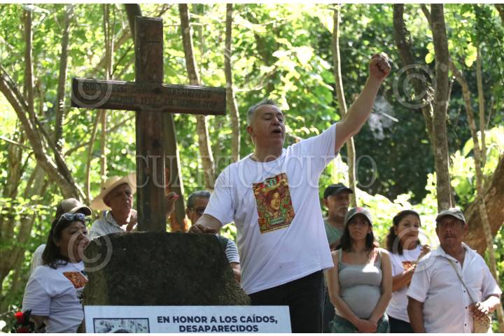 TECPAN DE GALEANA, GUERRERO, 01DICIEMBRE2024.- Familiares, compañeros de lucha y decenas de simpatizantes de Lucio Cabañas, maestro, guerrillero, y líder del Brigada Campesina de Ajusticiamiento del Partido de los Pobres , acudieron al sitio donde murió en combate el 2 de diciembre de 1974. Realizaron un acto de memoria en la cañada del Otatal, dónde llevaron una ofrenda floral para recordar la lucha del profesor que se remontó a la sierra cafetalera de Atoyac de Álvarez luego de la represión que realizó el gobierno de Guerrero el 18 de mayo de 1967, dónde murieron cinco personas, incluida una mujer embarazada y dos agentes policiacos. En medio de vivas a los guerrilleros caídos en combate y palabras muy emotivas se recordó la muerte de Lucio Cabañas, Lino Rosas Pérez y Esteban Mesino Martinez y la detención del adolescente Marcelo Serafín Juárez, quién desde entonces fue desaparecido por el Estado. En la imagen, Diego Lucero Estrada, hijo del guerrillero Diego Lucero abatido en 1972. FOTO: MARGARITO PÉREZ RETANA/CUARTOSCURO.COM