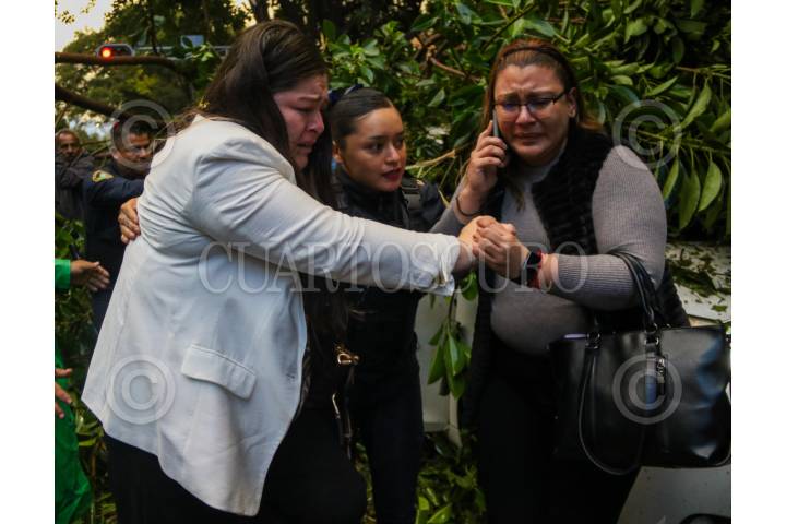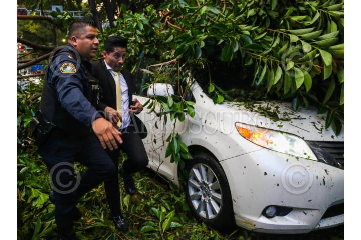 Vecinos de la calle Dr. Vera rescatan a un menor que quedó atrapado al interior de una camioneta, que fue aplastada por un árbol junto con un auto de lujo. Bomberos y rescatistas acudieron al llamado de auxilio.
