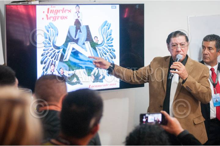 CIUDAD DE MÉXICO., 22AGOSTO2017.- Mario Gutierrez, director y fundador de Los Ángeles Negros, durante la conferencia que se organizó con varios integrantes de grupos como Los Ángeles Azules, Los Ángeles Negros, Los Caminantes, Cañaveral, La Sonora Dinamita, Acapulco Tropical, Los Dandys, Los Solitarios, Los Chicanos, Los Pasteles Verdes, Los Freddys, Indio, Los Apson, para anunciar que tomarán medidas contra el Instituto Nacional del Derecho de Autor (INDAUTOR) y sus normas que han violado sus derechos de autor. FOTO: DIEGO SIMÓN SÁNCHEZ /CUATOSCURO.COM