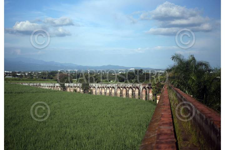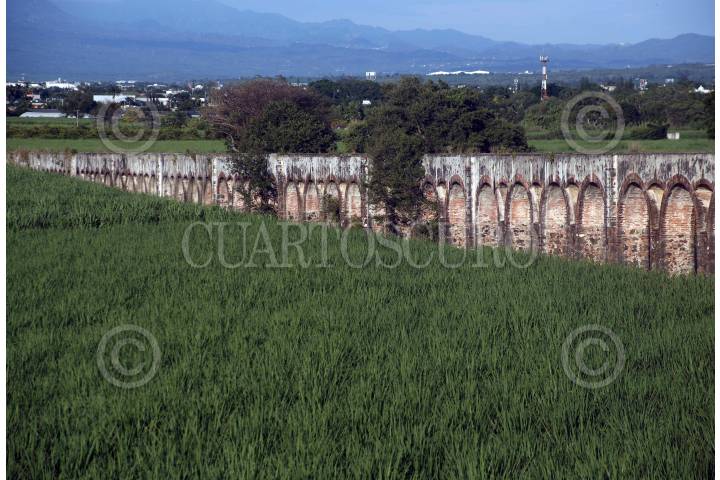 CUAUTLA, MORELOS, 14AGOSTO2019. El acueducto de la Ex Hacienda de Calderón emerge en medio de un enorme cañaveral, una magnífica obra de la ingeniería de su época que perdura afectado por el paso del tiempo y el abandono. FOTO: MARGARITO PÉREZ RETANA /CUARTOSCURO.COM