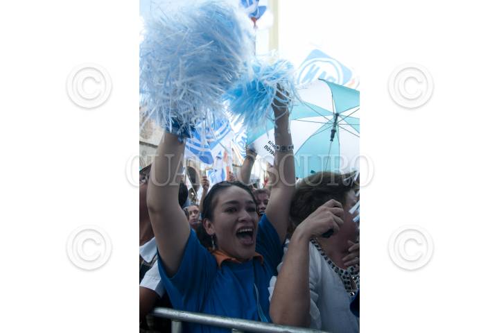 PURUANDIRO, MICHOACÁN, 08NOVIEMBRE2011.- Simpatizantes de la candidata del Partido Acción Nacional y Nueva Alianza, Luisa María Calderón Hinojosa, le dan la bienvenida agitando banderas, la candidata, quien visitó la cabecera municipal y de donde su madre es natal prometió regresar la seguridad a la región de ganar las elecciones del 13 de Noviembre donde se renueva la gubernatura del estado. FOTO: FRANCISCO RODRÍGUEZ/CUARTOSCURO.COM