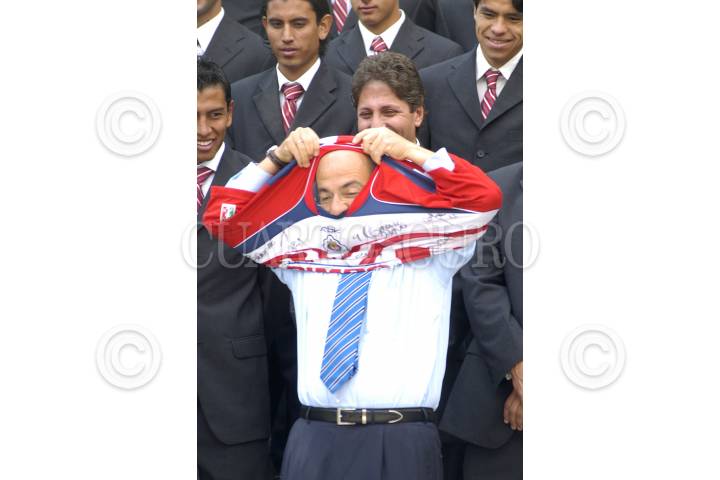 MÉXICO, D.F. 03ENERO2007.- Felipe Calderón Hinojosa, primer mandatario mexicano, se colocó una playera de las Chivas Rayadas del Guadalajara durante la fotografía oficial del equipo campeón del Torneo de Apertura 2006 a la Residencia Oficial de Los Pinos. FOTO: IVÁN STEPHENS/CUARTOSCURO.COM