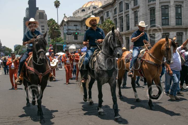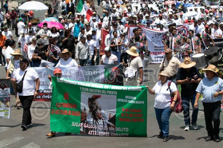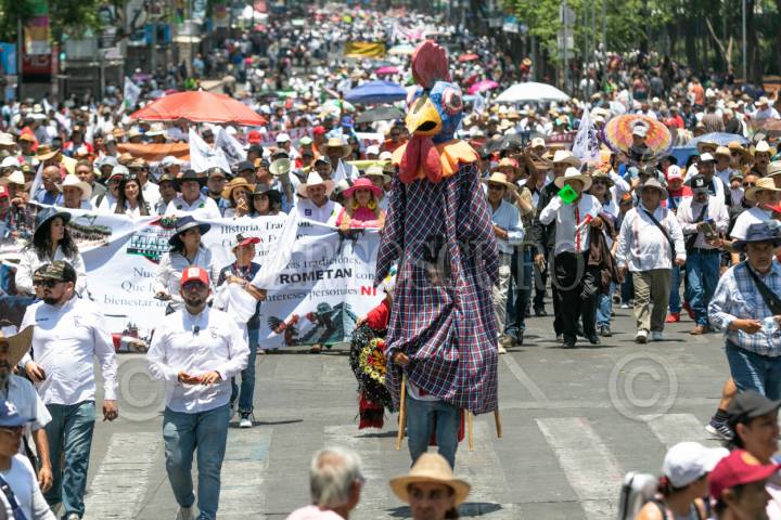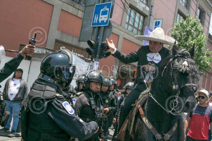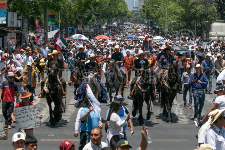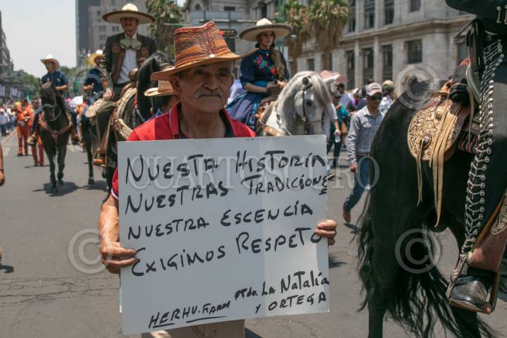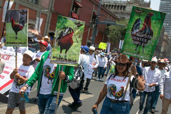 CIUDAD DE MÉXICO, 07MAYO2024.- Criaderos de gallos y toros de lidia marcharon del Monumento a la Revolución rumbo al zócalo para exigir que se impida la prohibición de las peleas de gallo o cría de toros de lidia, ya que señalan que son miles de personas que dependen de esta actividad económica, además de que son parte de las tradiciones nacionales. El contingente estaba encabezado por charros a caballo a quienes la policía capitalina les impidió el paso cuando intentaron llegar al zócalo. El contingente se dirigió al zócalo en donde buscaron hacer llegar sus demandas al Jefe del Ejecutivo. FOTO: MOISÉS PABLO/CUARTOSCURO.COM