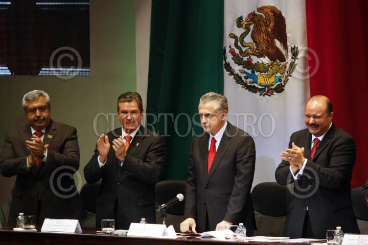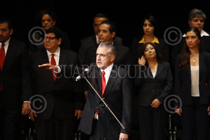 CIUDAD, JUÁREZ, CHIHUAHUA, 10OCTUBRE2013.- Enrique Serrano tomó protesta como alcalde de la ciudad en sesión solemne de Cabildo en el Centro Cultural Paso del Norte. En el evento estuvo presente el gobernador del estado César Duarte Jaquez. FOTO: NACHO RUIZ /CUARTOSCURO.COM