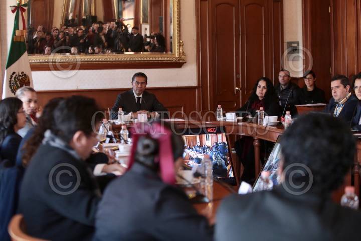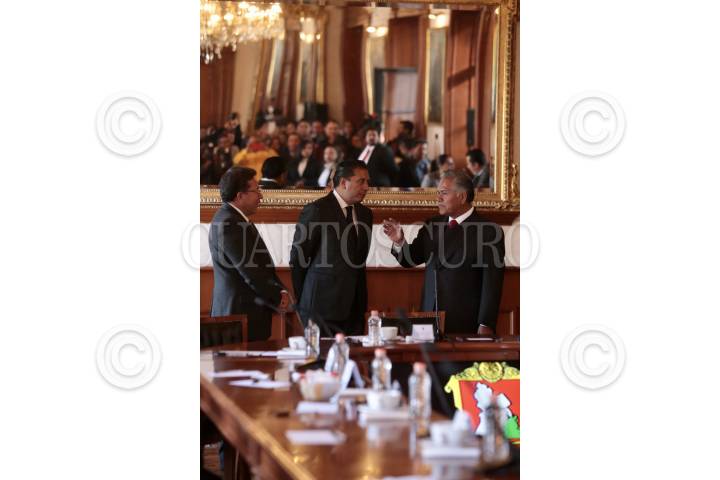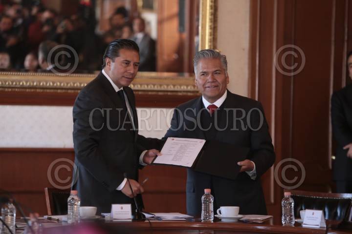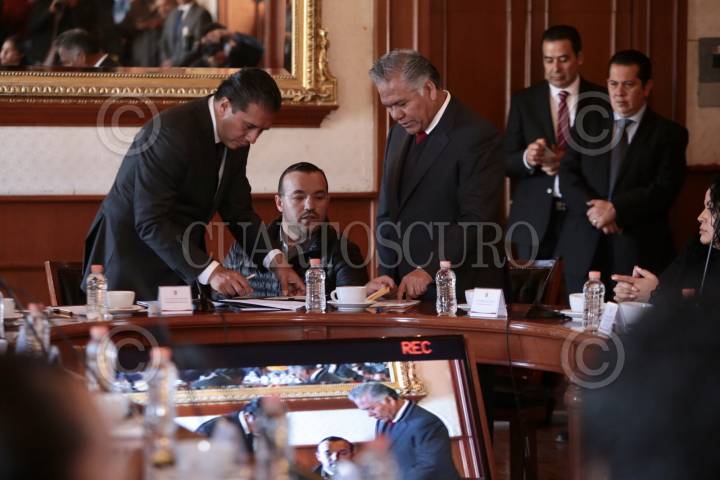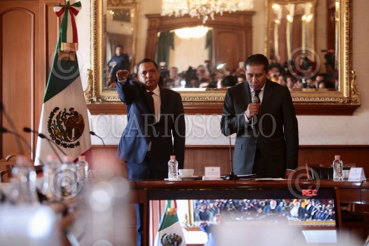 TOLUCA, ESTADO DE MÉXICO, 01ENERO2019.- Durante sesión de Cabildo en Toluca se realizó la entrega recepción del presidente municipal saliente Fernando Zamora y el presidenti municipal entrante Juan Rodolfo Sánchez Gomez para el periodo 2019-2021; Ricardo Moreno Bastida tomó protesta como Secretario del Ayuntamiento, y se indicó que una de las primeras tareas de esta administración será el bacheo en la cuidad. FOTO: ARTEMIO GUERRA BAZ /CUARTOSCURO.COM
