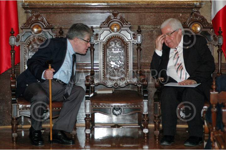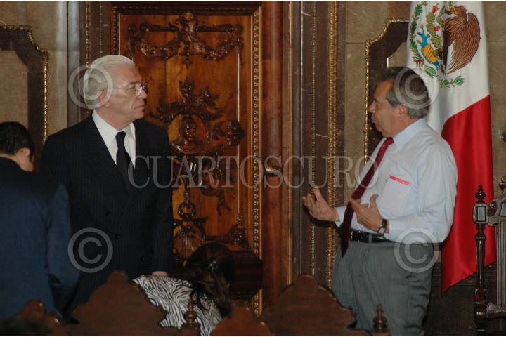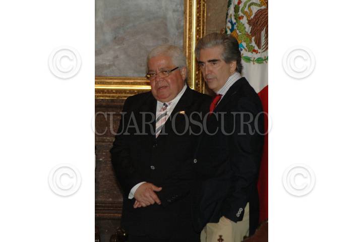 MÉXICO, D.F., 25 JUNIO2009.- Enrique Marquez, coordinador de festejos de Bicentenario y Rafael Tovar y de Teresa antes de dar inicio la ceremonia en donde se le otorgo la Medalla 1808 al escritor José Emilio Pacheco en el Salón de los Cabildos. FOTO: RODOLFO ANGULO/CUARTOSCURO.COM