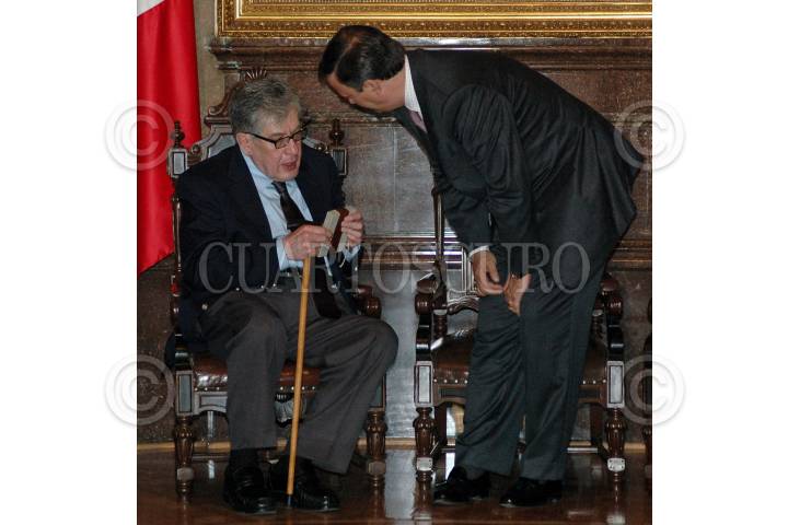 MÉXICO, D.F., 25 JUNIO2009.- El escritor José Emilio Pacheco conversa con Enrique Marquez, coordinador de festejos de Bicentenario durante la ceremonia en donde se le otorgo la Medalla 1808 al escritor en el Salón de los Cabildos. FOTO: RODOLFO ANGULO/CUARTOSCURO.COM