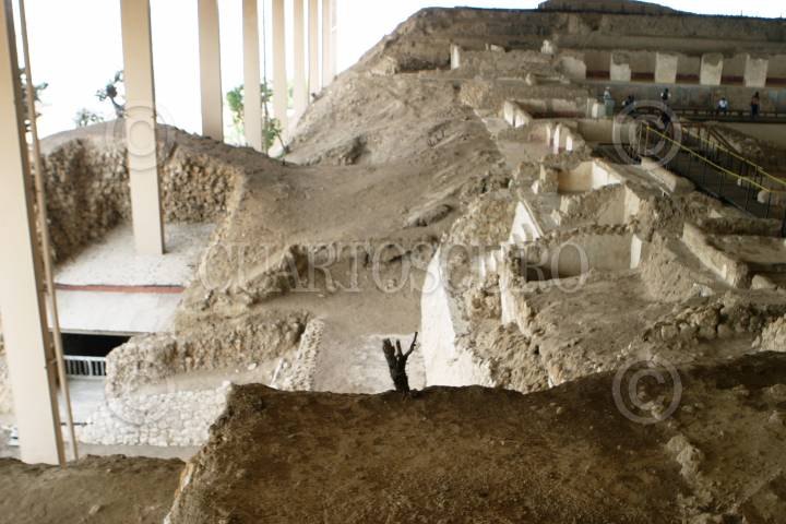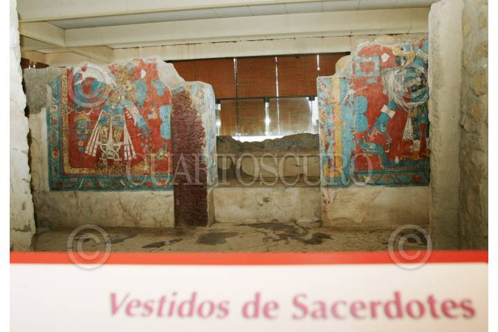 SAN MIGUEL DEL MILAGRO, TLAXCALA 31AGOSTO2005.- Continuan los trabajos de retauración en los murales prehispanicos del museo de la zona arqueológica de Cacaxtla. La area esta integrada por plataformas y rodeada por fosos de cuatro a nueve metros de profundidad, y el sitio contiene los elementos arqueológicos denominados Los Cerritos, la Plaza de las Tres Pirámides y el Gran Basamento. FOTO: Germàn Romero/CUARTOSCURO.COM