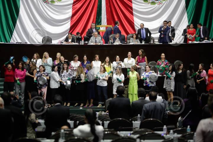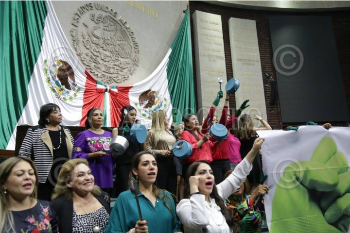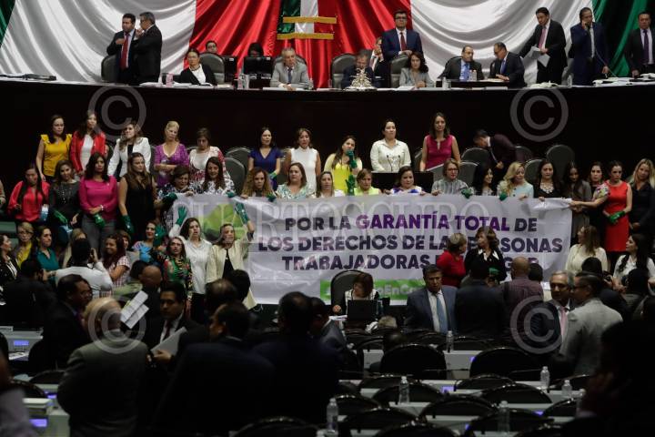 CIUDAD DE MÉXICO, 29ABRIL2019.- Con cacerolas, cucharas y guantes verdes diputadas federales de todas la fracciones legislativas de San Lázaro tomaron la tribuna para exigir que en el Senado se dictamine la minuta en la cual se contempla la seguridad social de la trabajadoras del hogar. FOTO: CUARTOSCURO.COM
