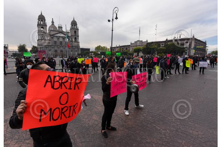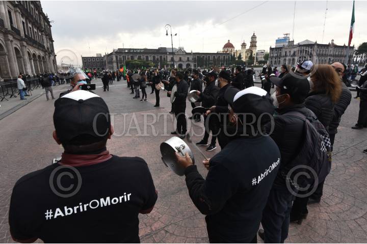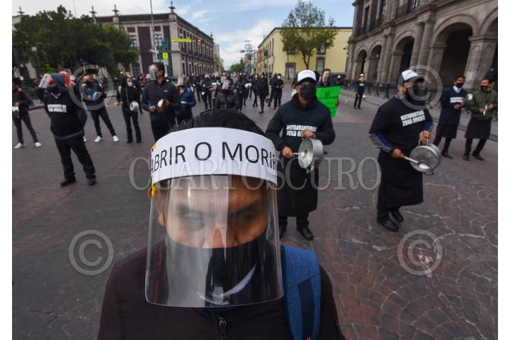 Trabajadores de restaurantes realizaron un cacerolazo #AbrirOmorir frente a Palacio de Gobierno haciendo un llamado de auxilio para no cerrar de forma definitiva ante la pandemia por COVID-19.