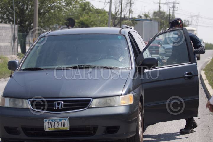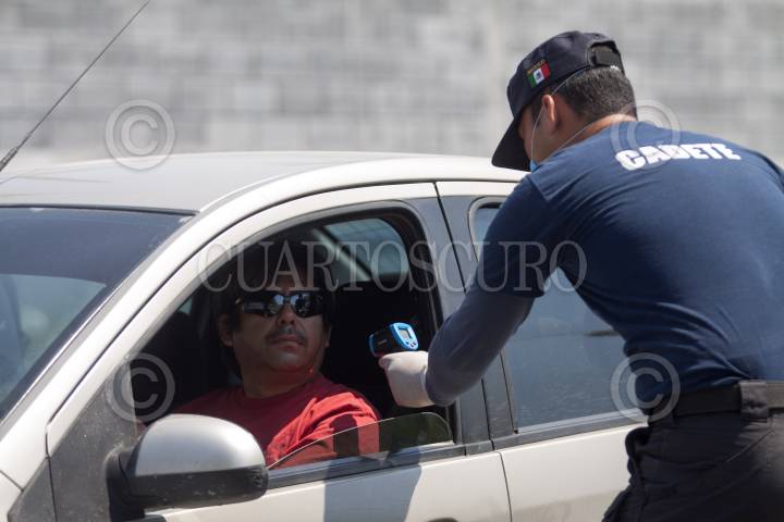 CADEREYTA, JIMÉNEZ, NUEVO LEÓN, 28MARZO2020.- Policía local del municipio de Cadereyta, realizan un cerco sanitario aleatorio a automovilistas en la autopista Monterrey-Reynosa, para tomar la temperatura corporal y registrar datos de viaje reciente a Estados Unidos. Hasta el momento, Cadereyta no registra personas contagiadas de covid-19 a pesar de su cercanía al área metropolitana de Monterrey. FOTO: GABRIELA PÉREZ MONTIEL / CUARTOSCURO.COM