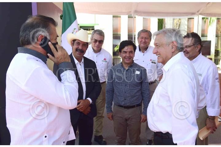 Jaime Rodríguez "El Bronco", Andrés Manuel López Obrador, Octavio Romero Oropeza, y Alfonso Romo, durante el anuncio de obras de rehabilitación en la refinería de Cadereyta.