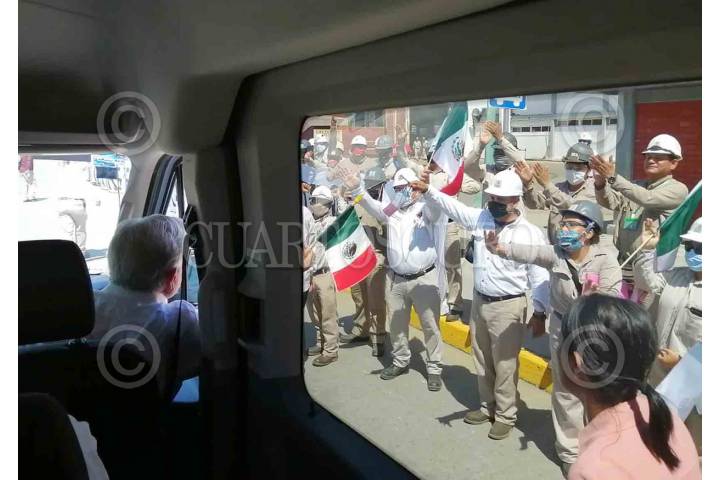 Trabajadores de Pemex saluda a Andrés Manuel López Obrador, en la refinería de Cadereyta.