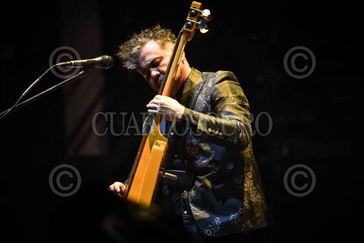 CIUDAD DE MÉXICO, 05DICIEMBRE2024.- Café Tacvba, banda mexicana de rock alternativo, durante su presentación está noche en el Estadio GNP Seguros como parte de su gira en conmemoración de sus 35 años de trayectoria. En la imagen, Enrique Rangel, bajista de la banda. FOTO: MARIO JASSO/CUARTOSCURO.COM