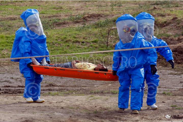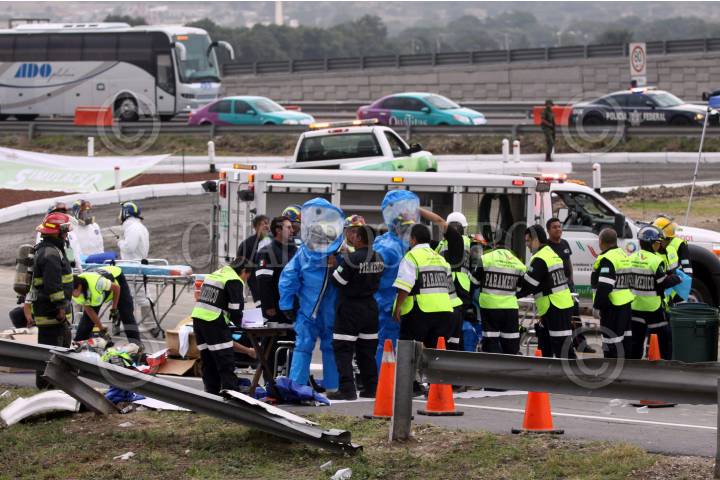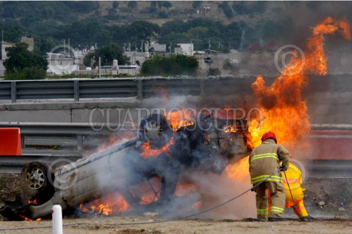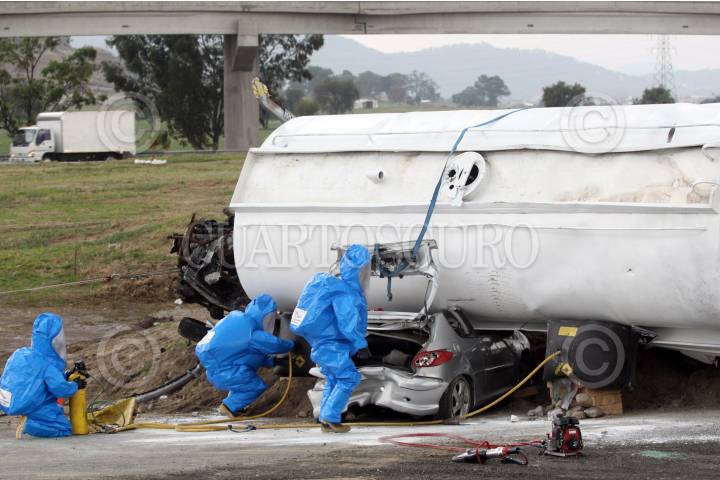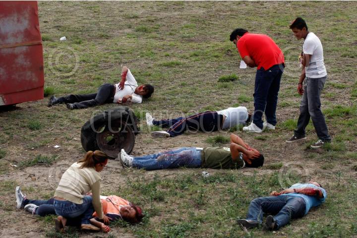 PUEBLA, PUEBLA, 15MAYO2012.- Elementos de CAPUFE, paramédicos de cruz roja, protección civil estatal, SUMA, bomberos y elementos del ejército mexicano, participaron en un simulacro de accidente por alcance múltiple, en el que se involucraron tres automóviles particulares, un camión de redilas y una pipa que transportaba material químico; en el kilómetro 138 de la autopista Puebla-Orizaba. FOTO: HILDA RIOS /CUARTOSCURO.COM