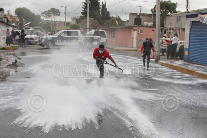 VALLE DE CHALCO, ESTADO DE MÉXICO, 16FEBRERO2010.- Una trabajador de CONAGUA rocía cal para evitar la propagación de infecciones en calles de la colonia San Isidro, tras la inundación que ocasionó el desbordamiento del canal de aguas negras "La Compañia". FOTO: SAÚL LÓPEZ/CUARTOSCURO.COM
