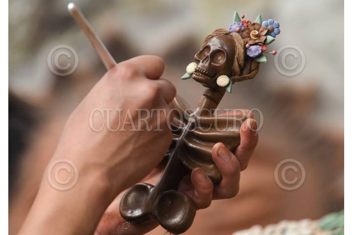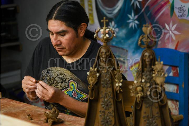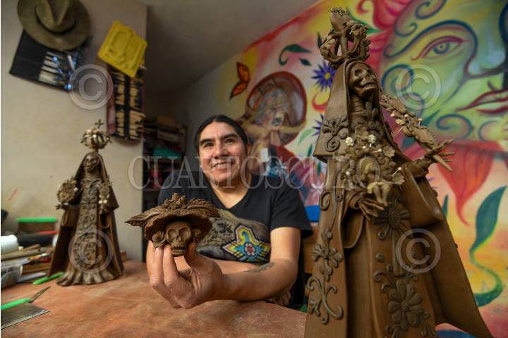 METEPEC, ESTADO DE MÉXICO, 24OCTUBRE2024.- Cecilio Sánchez Fierro artesano de Metepec con más de 30 años dándole vida al barro y siendo la cuarta generación en su familia, herencia de sus abuelos maternos, que se dedicaban a hacer cazuelas y utilitarios, aprende de sus hermanos y su papá, en su taller trabaja árboles de la vida, virgenes, pero las piezas más representativas son las catrinas, calaveras, cráneos, esqueletos, monjas coronadas, que son muy pedidas durante la celebración de Día de Muertos, pero las trabaja todo el año, las técnicas por las que se reconoce su trabajo es por el barro pigmentado, arcillas naturales y actualmente el barro negro, elabora piezas pequeñas que van desde los 3 cm hasta las más grande que ha llegado a ser de 2 metros de altura; su papá empezó a elaborar piezas como estas de todo tipo, y ahí nace el gusto por las mismas, considera que la expresión en la muerte es muy amplia. En su taller abre las puertas a la juventud para que aprendan este hermoso trabajo, a pesar de que a los jóvenes ya no les interesa aprender el manejo del barro, es ferviente admirador de todas la artesanía pide que se valore el trabajo de los artesanos y no se regatee, su trabajo se puede adquirir en el Mercado Artesanal ubicado muy cerca del centro de Metepec o a través de sus redes sociales. FOTO: CRISANTA ESPINOSA AGUILAR /CUARTOSCURO.COM