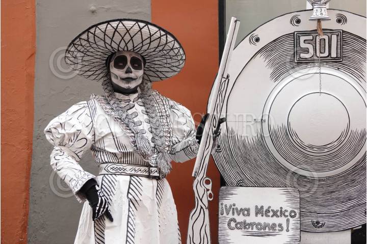 GUANAJUATO, GUANAJUATO, 27OCTUBRE2024.- En vísperas de la celebración del Día de Muertos, una charra caracterizada de catrina espera que los transeúntes se tomen fotografías en el centro de Guanajuato. FOTO: GRACIELA LÓPEZ/CUARTOSCURO.COM
