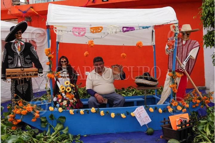 CIUDAD DE MÉXICO, 01NOVIEMBRE2024. Visitantes pasean por la mega ofrenda instalada en el zócalo capitalino. Un organillero pintado de esqueleto se encuentra en la Mega Ofrenda del zócalo atrayendo a turistas y paseantes. FOTO: EDGAR NEGRETE LIRA/CUARTOSCURO.COM