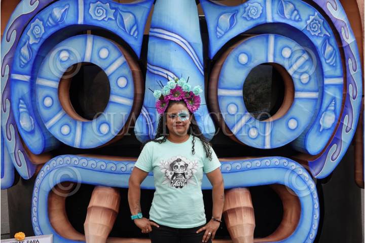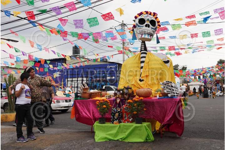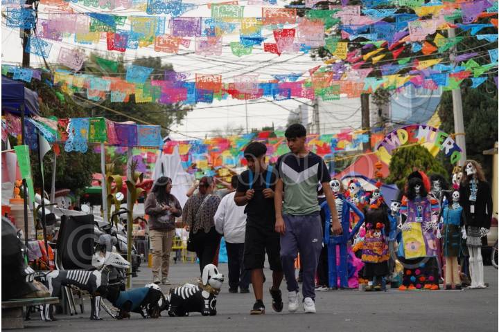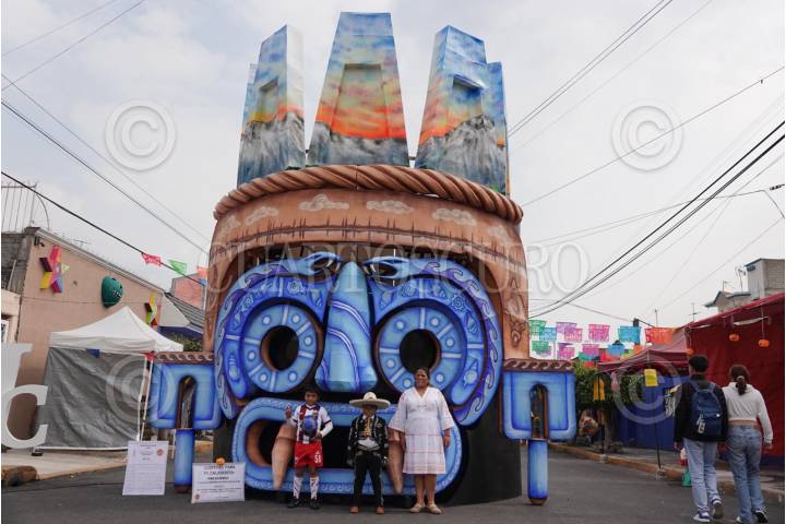 CIUDAD DE MÉXICO, 01NOVIEMBRE2024.- Como cada año, el colectivo Jaén Cartonería, colocó calavera hechas a mano y una ofrenda al Dios Tláloc en la calle de Francisco Santiago Borraz, en la alcaldía Tláhuac para conmemorar el Día de Muertos. El Dios Tláloc mide 6 metros de altura, está hecha a base de cartón, pintada a mano con mascaras de tecuanes del estado de Guerrero y en los ojos se proyectan escenas de festividades de este estado. La dualidad de estos símbolos representan el agradecimiento por la lluvias de este año y en honor a las víctimas que murieron en el huracán Otis, en el estado de Guerrero. FOTO: GRACIELA LÓPEZ/CUARTOSCURO.COM