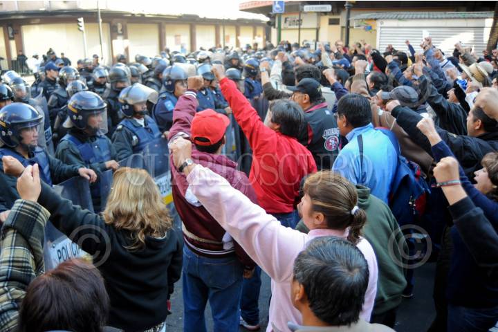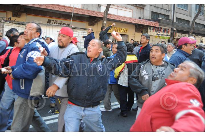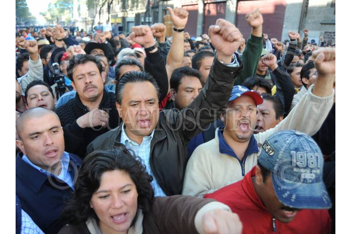 MEXICO D.F., 29NOVIEMBRE2009.- Miembros y simpatizantes del Sindicato Mexicano de Electricistas (SME) encabezados por Martin Esparza se manifestaron en calles aledañas al Zocalo al mismo tiempo que en Palacio Nacional se desarrollaba un evento del presidente Felipe Calderon. Elementos del cuerpo de granaderos les bloquearon el paso en la avenida 20 de Noviembre y Venustiano Carranza y cuando se retiraron aventaron huevos a los uniformados. FOTO: IVAN MENDEZ/CUARTOSCURO.CIOM