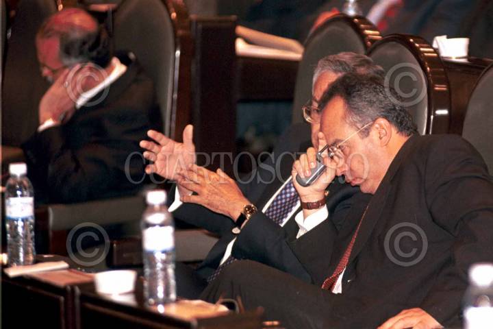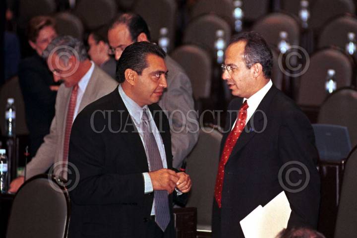 El senador Juan José Rodriguez Pratts y el coordinador de los diputados panistas Felipe Calderon Hinojosa intercambian opiniones previo al inicio de la Instalación de la Comisión Permanente del Congreso. FOTO: Oswaldo Ramírez/CUARTOSCURO.COM