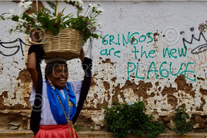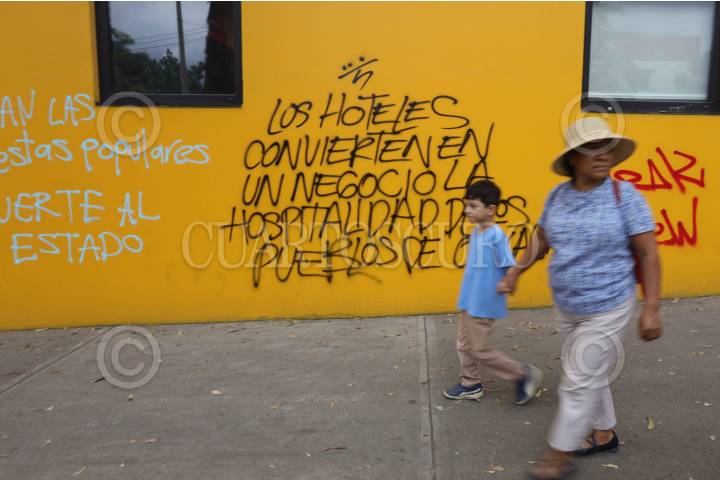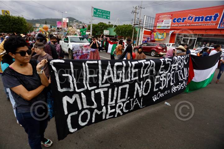 OAXACA, OAXACA, 21JULIO2024.- Está tarde la Sección 22 de la Coordinadora Nacional de Trabajadores de la Educación (CNTE), celebró la XVII Calenda Magisterial y Popular para anunciar la Guelaguetza Popular que realizan de forma alternativa a la oficial. Durante esta actividad, un grupo de activistas realizaron pintas y gritaron consignas en contra de la gentrificación, el extractivismo cultural y el genocidio en Palestina. FOTO: CAROLINA JIMÉNEZ/CUARTOSCURO.COM