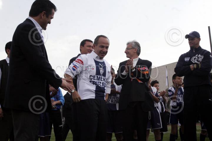PACHUCA, HIDALGO., 09FEBERERO2007.- El presidente Felipe Calderon Hinojosa, durante una visita a las instalaciones de la Universidad del Futbol Miguel Osorio Chong, gobernador de esta entidad, Carlos Hermosillo, titular de la Conade y Miguel Calero portero del equipo de los Tuzos. FOTO: ALFREDO GUERRERO/CUARTOSCURO.COM
