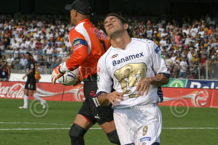 MEXICO,DF,04.MAYO,2008.- Ignacio Scocco, buscando daño a la porteria de Miguel Calero, durante el partido contra Pachuca que termino empatado cero a cero y las esperanzas de Pumas de entrar al repechaje terminaron. FOTO: PEDRO VALTIERRA/CUARTOSCURO.COM