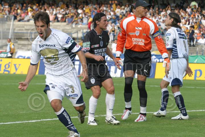 MEXICO, D.F. 17SEPTIEMBRE2005.- Miguel Calero (Pachuca) le gana un balón a Bruno Marioni (Pumas) en el partido de la jornada 8 del torneo de apertura 2005 en el que los pumas de la UNAM perdieron 3 goles a uno ante los "tuzos" del Pachuca. FOTO: Iván Stephens/CUARTOSCURO.COM